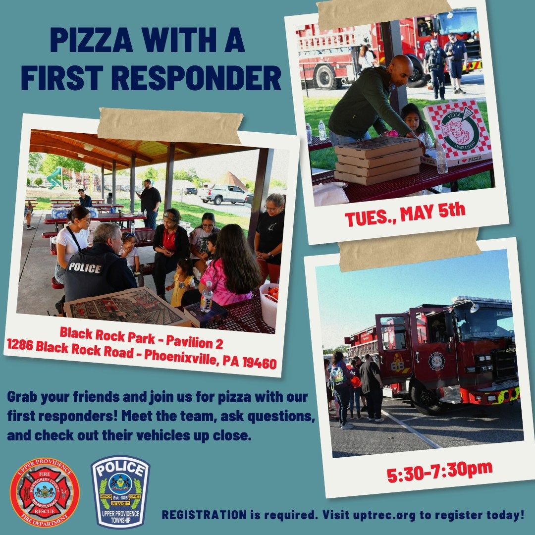 The “Pizza with a First Responder” event will take place on Tuesday, May 5 from 5:30 to 7:30 p.m. at Black Rock Park (Pavilion 2) in Phoenixville.